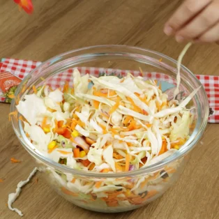 Para darmos inicio ao preparo dessa delicia, você deve primeiramente cortar ½ repolho em fatias e despejar tudo em uma tigela de vidro, logo após adicione 140g de milho, 1/2 pimentão vermelho picado, 1/2 cebola roxa picada, 1 cenoura inteira ralada, 100g de passas e depois misture bem tudo.