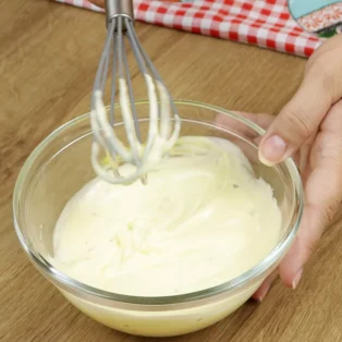 Em uma tigela de vidro, coloque 200g de maionese, 130g de iogurte natural, 1 colher de mostarda, pimenta preta a gosto, sal a gosto, 1 colher de vinagre de maçã, 2 colheres de azeite e mexa bem até ficar homogêneo.