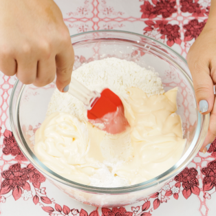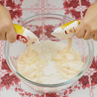 1.Em um recipiente, coloque a farinha, a maionese e o fermento.