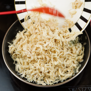 10.Em seguida adicione o frango e tempere com o sal, a pimenta do reino e a páprica