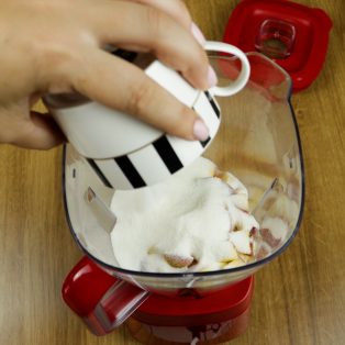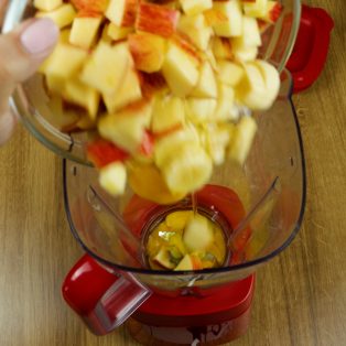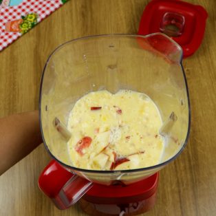 1.Em um liquidificador adicione a maçã, as bananas e os ovos.