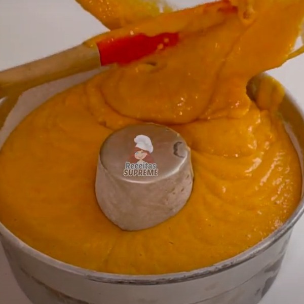 Logo depois, peneire o fermento na massa e misture com o auxílio de uma colher, prepare a forma que será assado, unte com manteiga e farinha de trigo, despeje a massa e leve ao forno para assar.