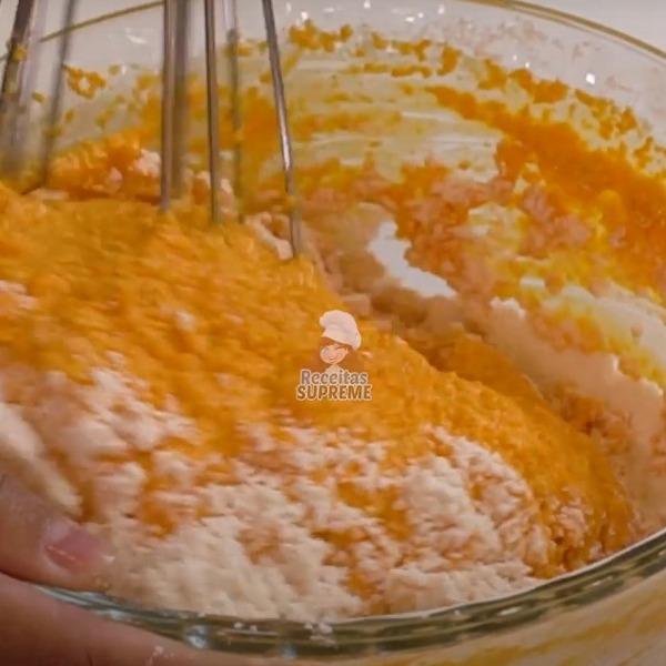 Em seguida, em uma tigela funda peneire o açúcar e o trigo, mexa com o auxílio de um fouet, junte o creme de cenouras e mexa até misturar.