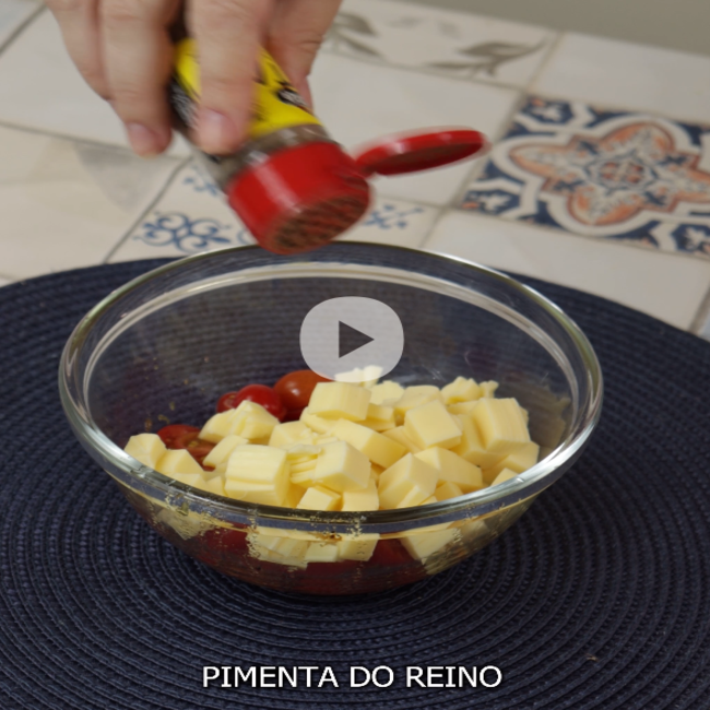 Logo após, em uma tábua de cortar pique os tomates cerejas ao meio e coloque na tigela com o óleo. Pique o queijo mussarela em cubos, coloque junto aos tomates cerejas, adicione farinha de rosca, pimenta-do-reino e alcaparras.