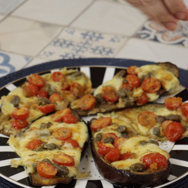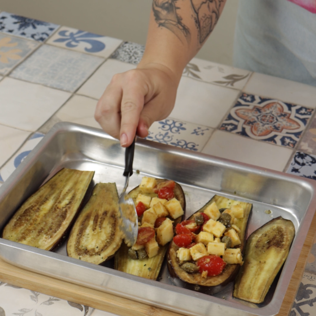 Posteriormente, misture bem e coloque porções dessa mistura por cima da berinjela pré assada. Então, leve ao forno para assar em 180º C por 15 minutos, para gratinar.