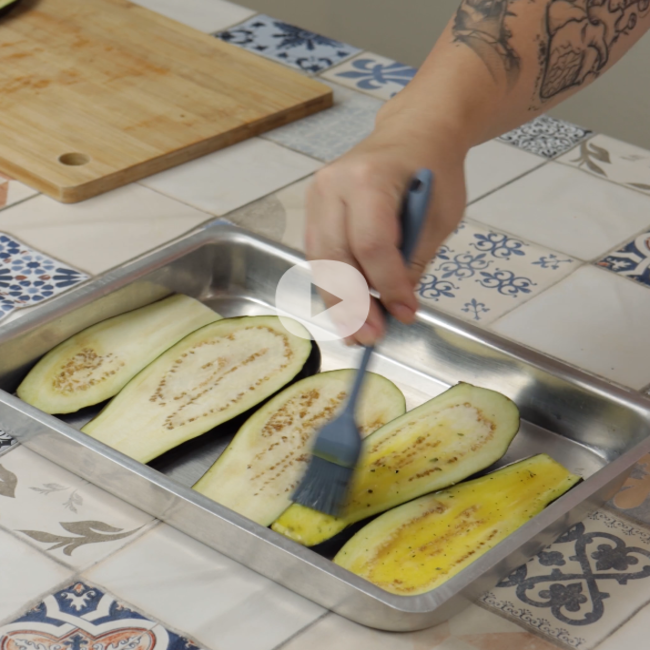 Em seguida, misture bem e coloque as berinjelas em uma assadeira e pincele a mistura de óleo por cima. Leve ao forno para assar em 200º C por 15 minutos.