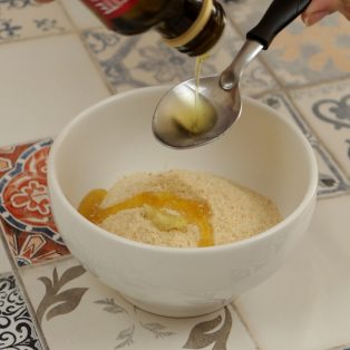 2.Em um tigela, adicione 150 gramas de farelo de pão, 1 alho, 6 colheres de sopa de azeite, e mexa bem.