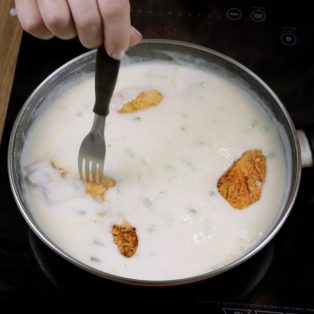 12.Adicione o frango, tampe a panela e deixe cozinhar  por cerca de 10 minutos.