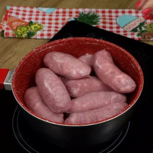 Para darmos início ao primeiro passo, você primeiramente deve encher uma panela com água, logo em seguida coloque 1kg de linguiças e deixe cozinhar por 10 minutos.