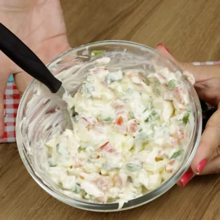 Em uma tigela de vidro, ponha 1 tomate picado, ½ pimentão verde picado, ½ cebola picada, cebolinha a gosto e 3 colheres de queijo cottage. Misture bem tudo.