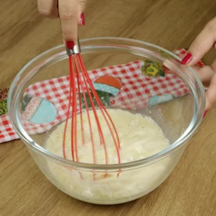 Para darmos início ao preparo, você deve primeiramente em uma tigela de vidro colocar 10g de fermento, 1 colher de chá de açúcar, 1 colher de chá de sal, 1 ovo, 1 copo de leite, 100ml de óleo e bater bem tudo.