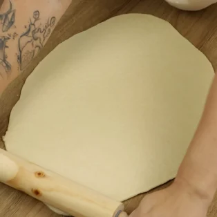 Recheie com 300g de salsicha, salsa a gosto, 150g de muçarela, e depois enrole e ponha em uma forma, pincele uma gema sobre a massa e rale queijo muçarela em cima.