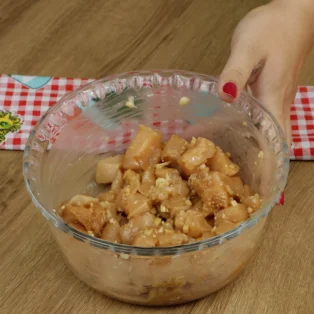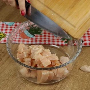 Para darmos início ao preparo, vamos primeiro cortar 2 peitos de frango em cubos e por em uma tigela de vidro.