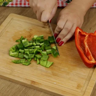 Corte 2 cebolas, ½ pimentão verde e ½ pimentão vermelho.