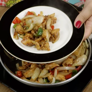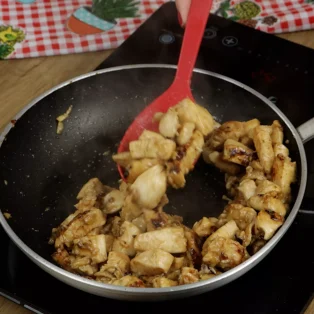 Unte uma frigideira com azeite e despeje nela o frango até terminar de fritar.