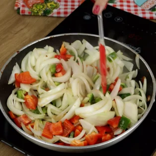 Novamente unte a frigideira com azeite e nela coloque 1 colher de chá de creme de alho, as cebolas e os pimentões.