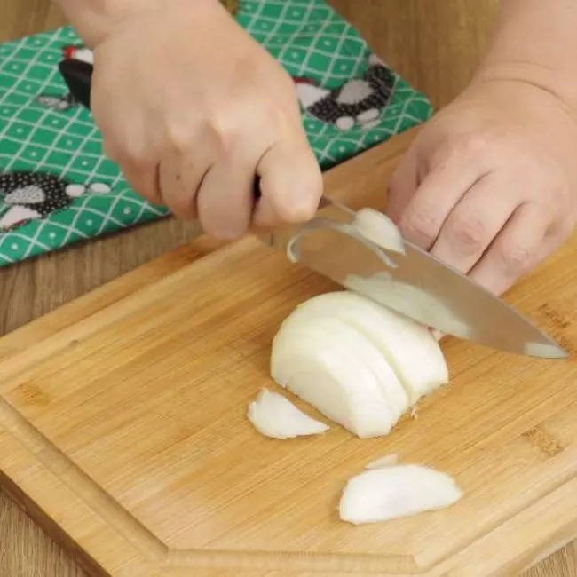 Nesse momento, enquanto ela cozinha faça o preparo do recheio de frango. Em uma tábua de cortar, corte a cebola e o peito de frango em pequenos cubos.