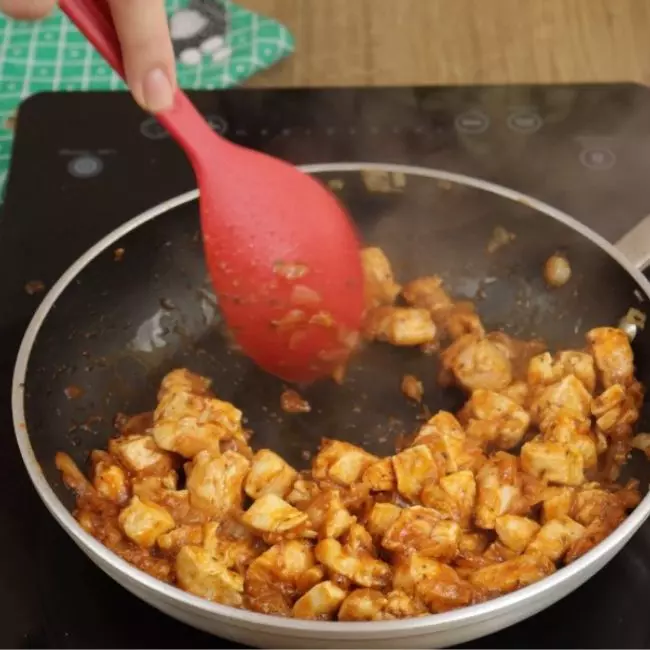 Logo após, em uma panela coloque a cebola cortada em cubos, um fio de óleo e os cubos de peito de frango. Deixe refogar por alguns minutos e tempere utilizando o sal, a páprica e a pimenta-do-reino. Misture bem por alguns segundos e adicione o orégano à gosto.