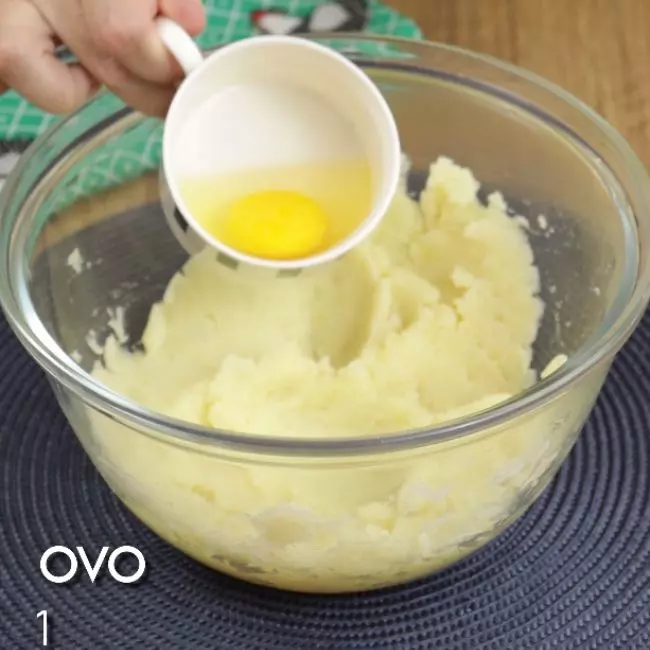 Posteriormente, refogue por alguns minutos e desligue. Nesse momento, escorra a água da batata e coloque em uma tigela, amasse formando um purê e em seguida coloque o ovo e a farinha de trigo.