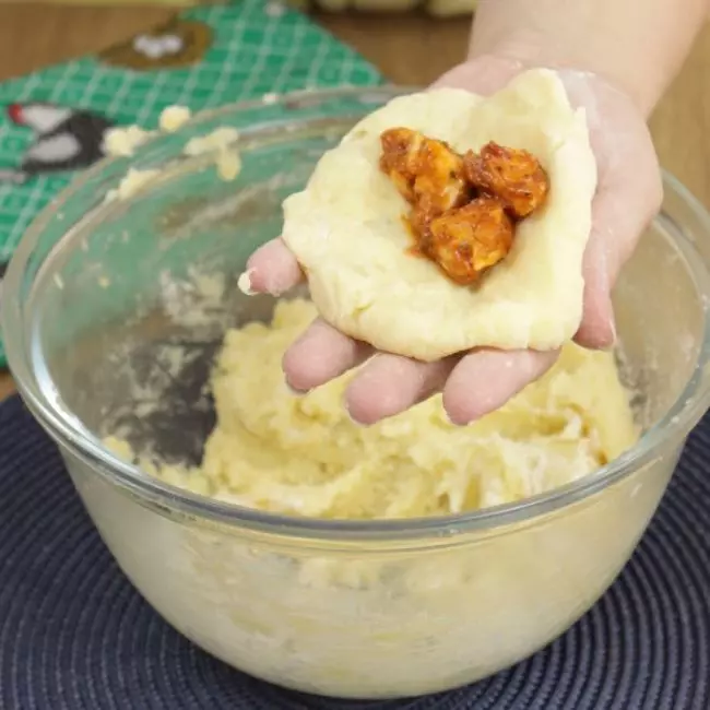 Depois, com as mãos higienizadas pegue pequenas porções de massa de batata e amasse, no centro coloque duas colheres de recheio de frango e feche formando um pastel.