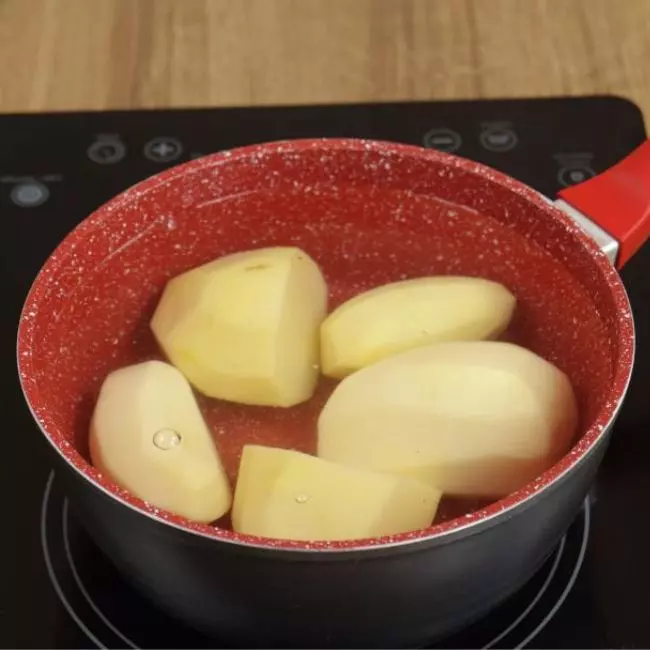 Inicialmente, descasque as batatas e coloque em uma panela com água e sal. Então, cozinhe por alguns minutos até que ela esteja al dente.