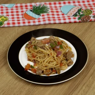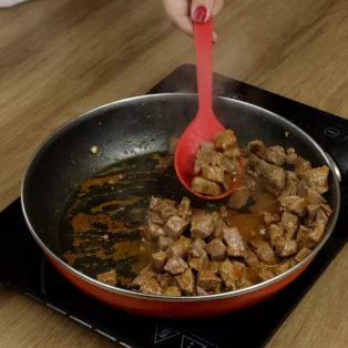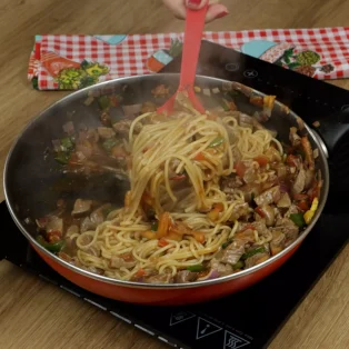 Na frigideira com os legumes, despeje a carne e o molho, e misture bem tudo