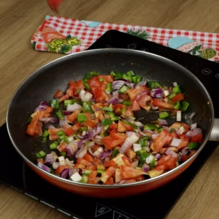 Na mesma frigideira, coloque 1 cebola picada, 1 tomate picado, 1 pimentão picado.