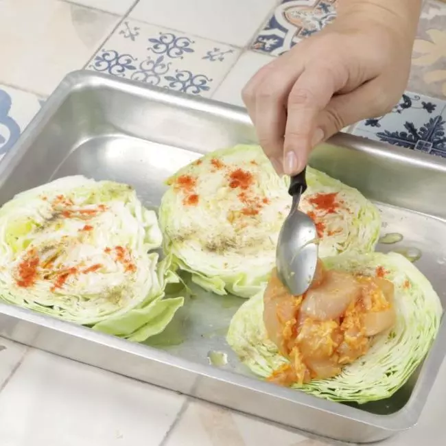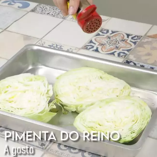 No início, corte a cabeça de repolho em 3 partes e coloque um uma forma untada com óleo. Depois, tempere utilizando sal, azeite de oliva, páprica e pimenta-do-reino.