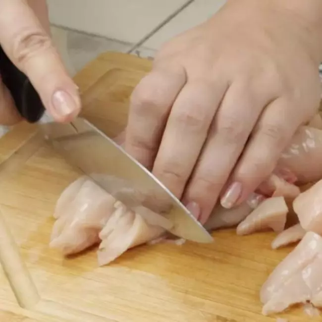 Na sequência, em uma tábua de cortar, pique o frango em pequenos cubos e coloque em uma tigela.