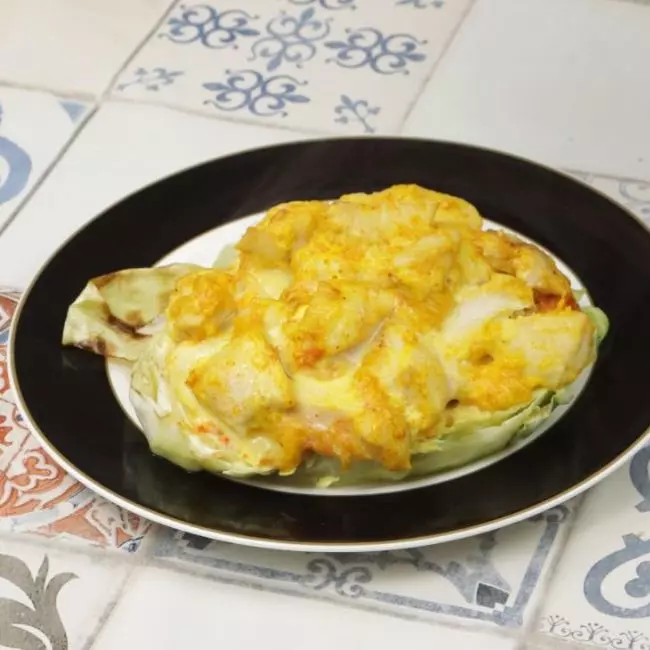 Posteriormente, coloque porções de frango por cima do repolho. Depois, leve ao forno para assar em 180º C por aproximadamente 40 minutos.