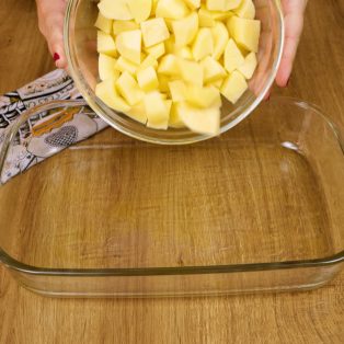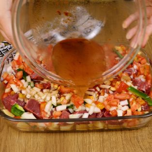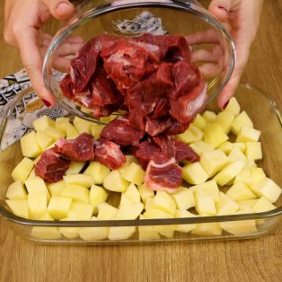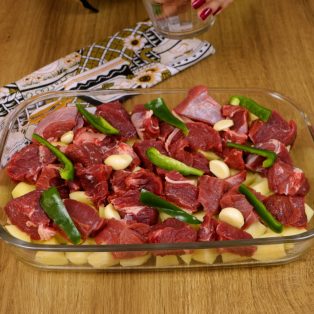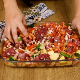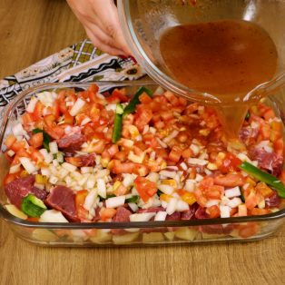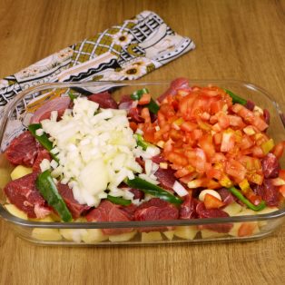 7.E por último o tomate e a cebola. Espalhe-os pela travessa.