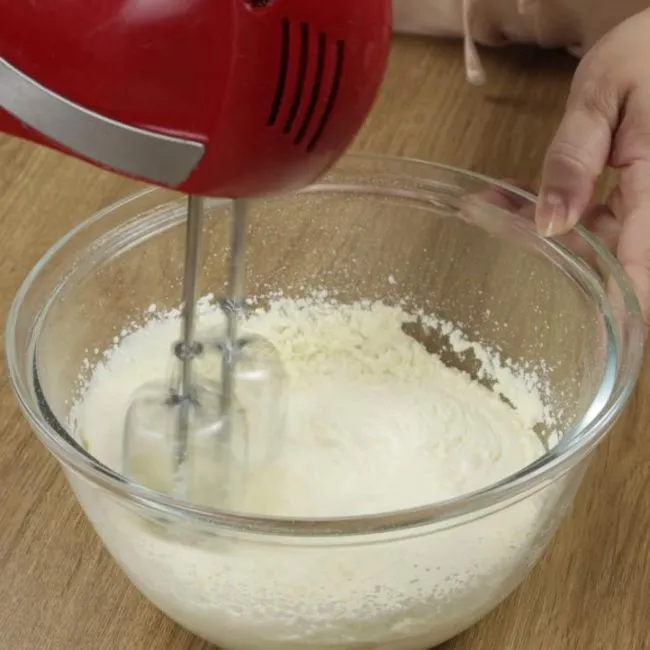 Na sequência, bata por alguns minutos com uma batedeira até dobrar o volume e ficar bem homogêneo.