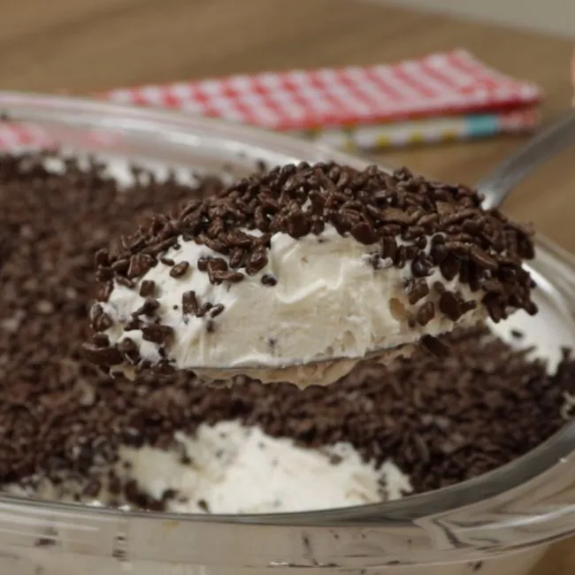 Por fim, salpique flocos de chocolate por cima e sirva a sua sobremesa rápida e fácil. Bom apetite!