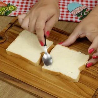 Como primeiro passo, você deve pegar 2 fatias de pão e passar manteiga neles.