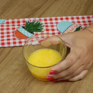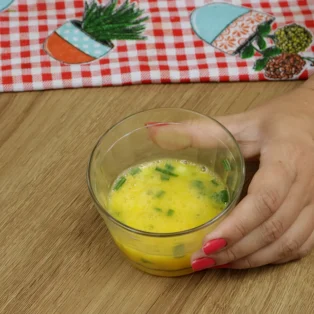 Em um recipiente de vidro, coloque 2 ovos, ½ meia colher de chá de sal e misture bem.