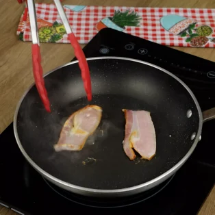 Em uma frigideira, frite 2 fatias de bacon.
