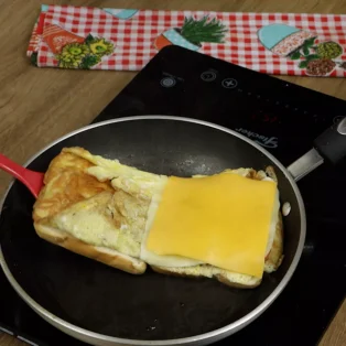 Unte uma frigideira com manteiga e despeje a mistura de ovo, enquanto o ovo frita, coloque 2 fatias de pão junto na frigideira. Vire e ponha sobre o pão 1 fatia de muçarela e 1 fatia de cheddar.