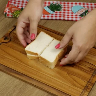 Pegue mais 2 fatias de pão, ponha uma fatia sobre a outra e as corte ao meio.