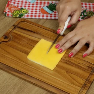 Coloque 1 fatia de muçarela e 1 de cheddar sobre a outra e as corte ao meio.