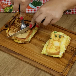 Unte uma frigideira com manteiga e nela despeje a mistura de ovo, ponha as fatias de pão cortadas ao meio junto do queijo e deixe fritar, após terminar de fritar é só montar seu sanduiche e estará pronta sua receita!