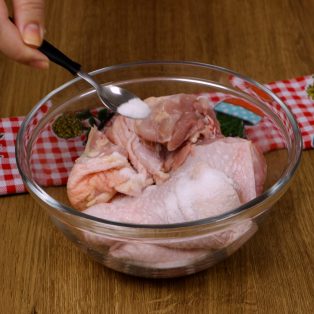1.Em um recipiente coloque o frango, o sal e o vinagre.