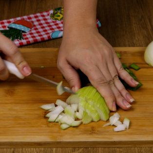 5.Em um tábua de carnes, corte o pimentão e a cebola à gosto.
