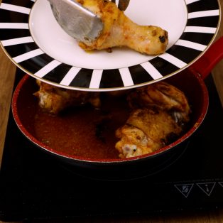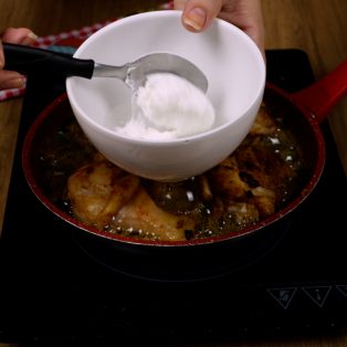 6. Em uma frigideira, adicione o óleo e as coxas de galinha.