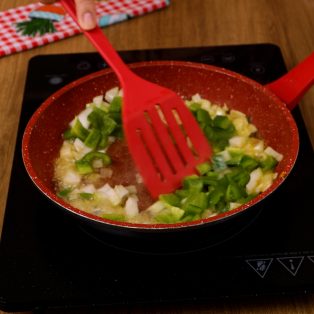 9.Na mesma frigideira, frite bem a cebola e o alho.
