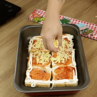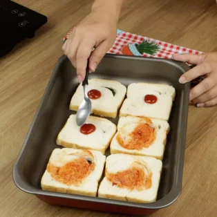 Para começar, separe uma forma que possa ir ao forno e posicione nela 6 fatias de pão de forma, e então coloque um pouco de ketchup no centro de cada uma das fatias e espalhe bem.