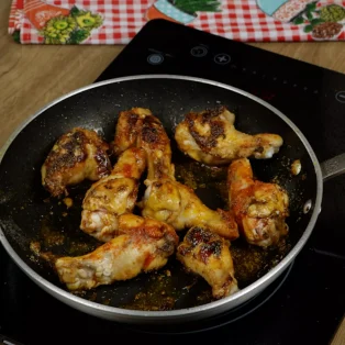Para darmos início ao preparo, vamos primeiramente untar uma frigideira com 2 colheres de azeite, por 1 colher de chá de açúcar, colocar 600g de frango, 1 colher de chá de sal, 1 colher de chá de pimenta preta, 1 colher de chá de páprica, 1 colher de cá de alho, e deixe fritar.