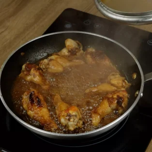 Jogue na frigideira com o frango, 200ml de água e 2 colheres de molho de soja.