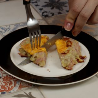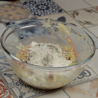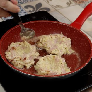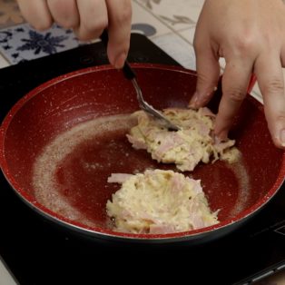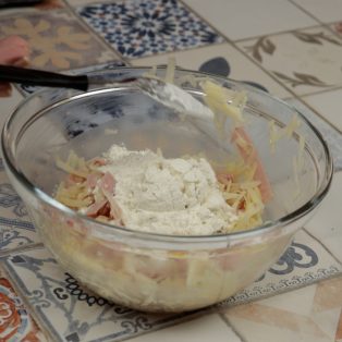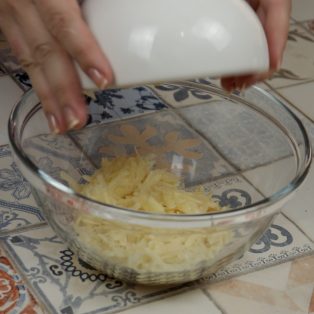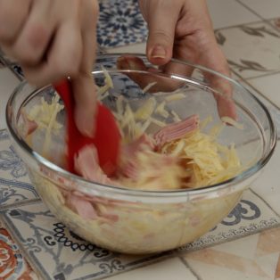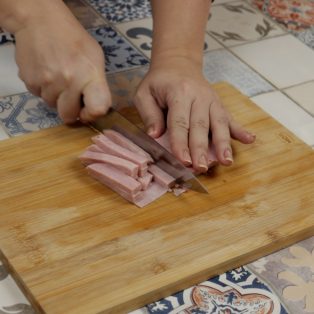 1.Rale uma batata e corte um presunto em tirinhas finas.
