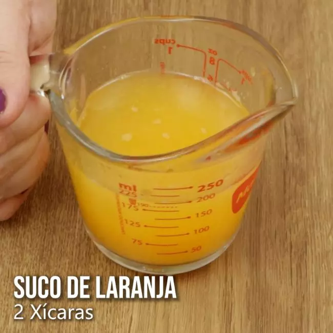 9.Pegue um jarra e adicione 2 xícaras de suco de laranja.