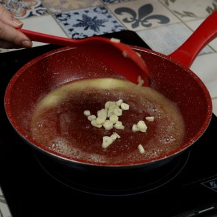 5.Em uma frigideira adicione azeite, a margarina e o alho.